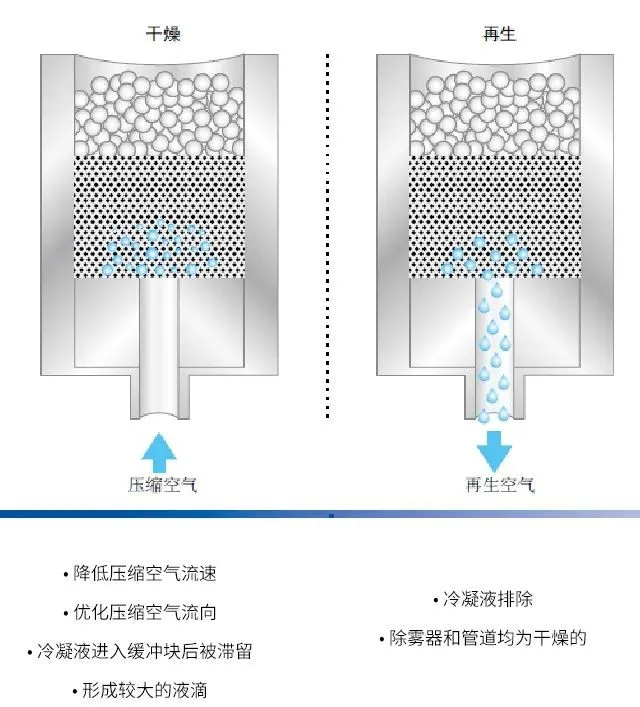 吸附剂罐在入口处设计有具备冷凝液分离和储存功能的高效沉淀室。此设计起到截留冷凝液不使其接触干燥剂的作用,冷凝液进入沉淀室后被滞留,在随后的再生过程中通过再生气排放。