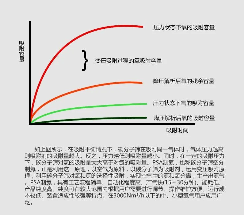 2. 解吸过程:在较低压力下,吸附的氧气及其他杂质被释放,吸附剂得到再生。
