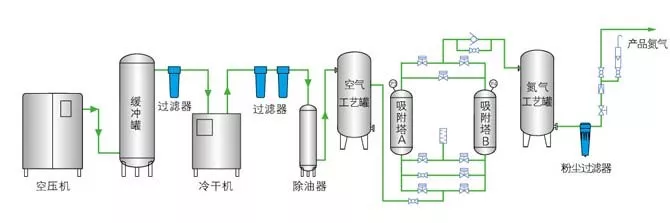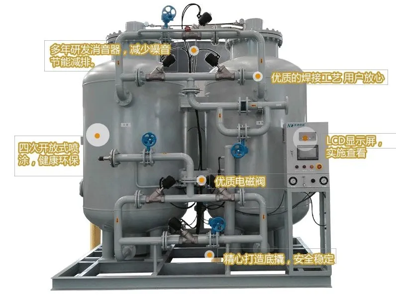 1. 吸附过程:空气被压缩并通过含有沸石分子的吸附塔。沸石具有选择性吸附特性,能优先吸附氧气和其他杂质,而氮气则通过。