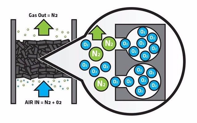 吸附:将空气通过分子筛床,分子筛吸附了氧气分子,而较大的氮气分子通过。