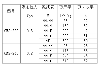 制氮机CMS碳分子筛的主要成分为元素碳,外观为黑色柱状固体。因含有大量直径为0.34nm,该微孔对氧分子的瞬间亲和力较强,因此有氮量大、氮气回收率高,使用寿命长等特点。碳分子筛空分制氮已广泛地应用于化学工业、石油天然气工业、电子工业、食品工业、煤碳工业、医药工业、电缆行业、金属热处理、运输及储存等方面广泛应用。